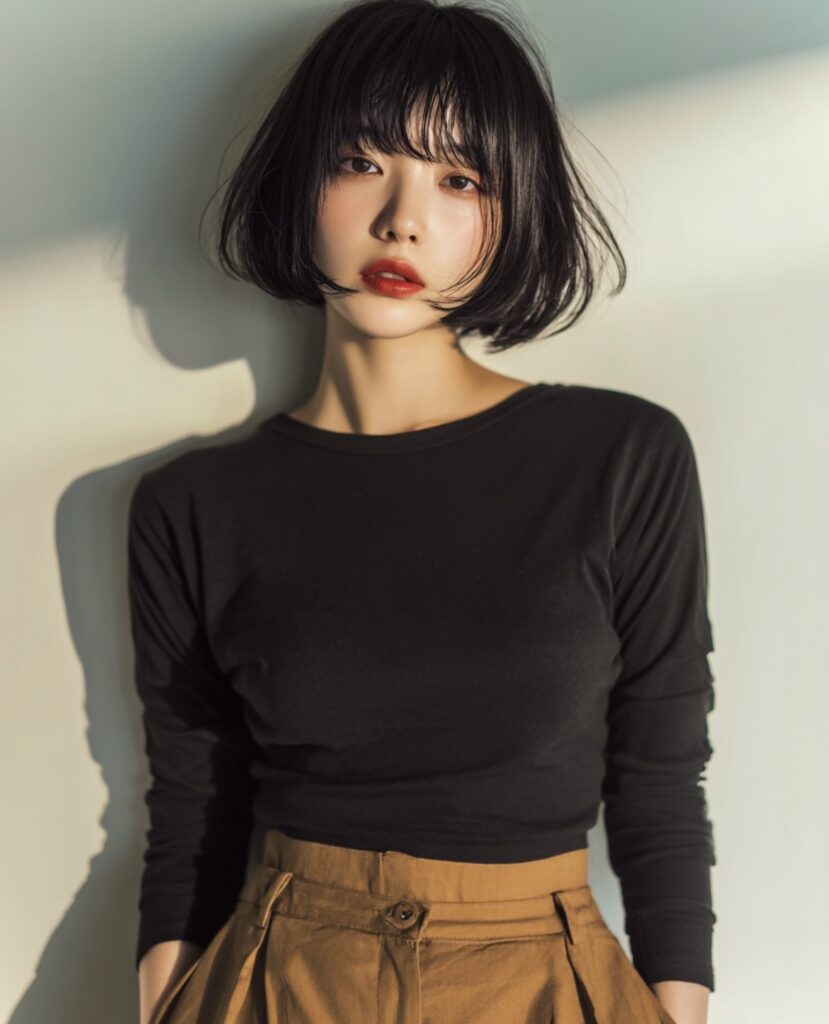 よくあるボブでも、スタイリング剤をつけて前髪や顔周りに束間をつくり、質感をウェットっぽくするだけで、いつもヘアスタイルも見映え、”こなれた人”に見えるのです。そこでリップも秋っぽい濃い目の色をつけると。かなり季節感もでてオシャレになりますよ!