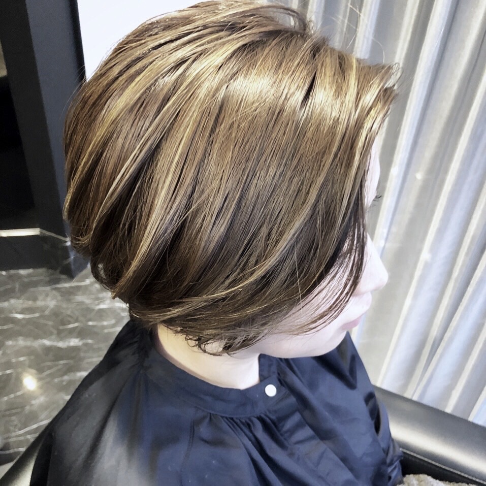 細く繊細なハイライトをブリーチで入れたあと、上から透明感のあるカラーを重ねることで、髪に柔らかさと立体感をプラス。さらに、白髪を目立ちにくくする白髪ぼかし効果もあるため、30代〜50代の大人世代から多くの支持をいただいています。