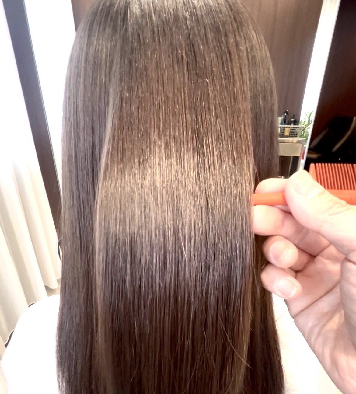 施術後は、ツヤのあるサラサラのストレートヘアに。後ろ姿を見ると、まるで別人のような仕上がりになりました。