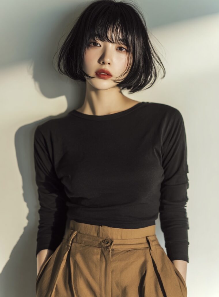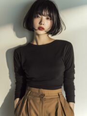 Name 切りっぱなしパッツンボブ Data カットあごラインの切りっぱなしボブ カラーダークアッシュ Point ナチュラルな黒髪に、シースルーバングを合わせた少しモードなスタイル。 バームやオイルでウェットな束間をつくるのがポイント!
